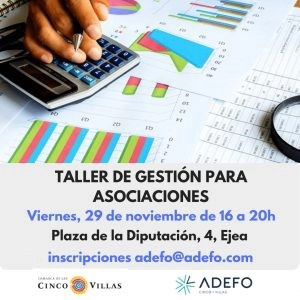 El próximo viernes 29 de noviembre, de 16.00 a 20.00 horas, tendrá lugar en la sede de Adefo Cinco Villas, en Ejea de los Caballeros, plaza de la Diputación n.º 4, un taller de formación sobre Gestión para Asociaciones, promovido en el marco del convenio entre la Comarca de Cinco Villas y Adefo Cinco Villas.