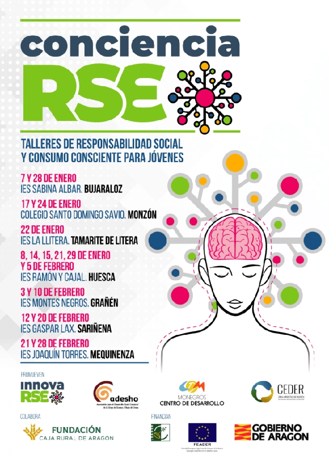 La Asociación para el desarrollo de la Hoya de Huesca (Adesho), Ceder Monegros y Ceder Zona Oriental (que agrupa a las comarcas del Bajo/Baix Cinca, Cinca Medio y La Litera), empiezan el año con la puesta en marcha de Conciencia-RSE, unos talleres con los que estos Grupos de Acción Local quieren dar conocer la importancia de la Responsabilidad Social en el medio rural y que cuentan con el apoyo de la Fundación Caja Rural de Aragón.Están dirigidos a jóvenes de los últimos cursos de ESO, bachillerato y formaciones profesionales y se desarrolla mediante dinámicas participativas y lúdicas, en sesiones de dos horas de duración.