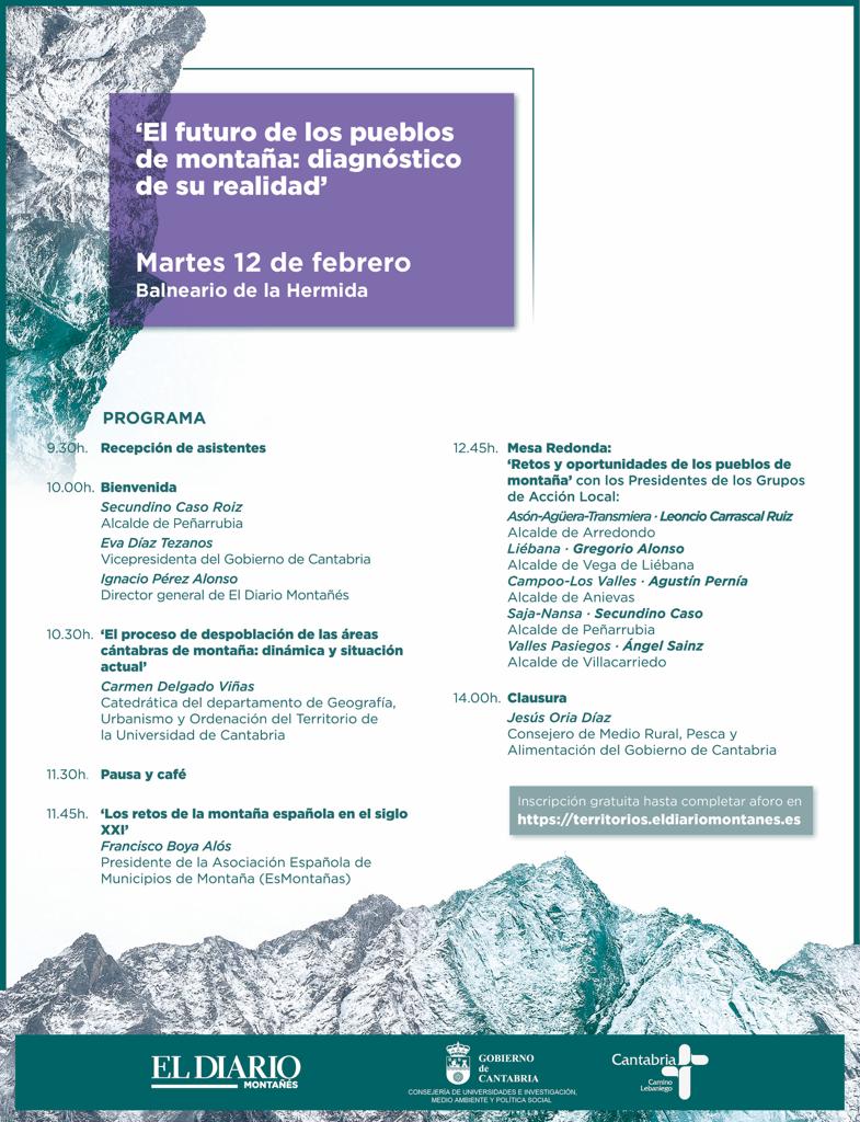 El próximo martes 12 de febrero, desde las 9:30h de la mañana se celebrará la jornada "El futuro de los pueblos de montaña: diagnóstico de su realidad" en el Balneario de La Hermida (Cantabria). La inscripción a la misma será gratuita, hasta completar aforo.