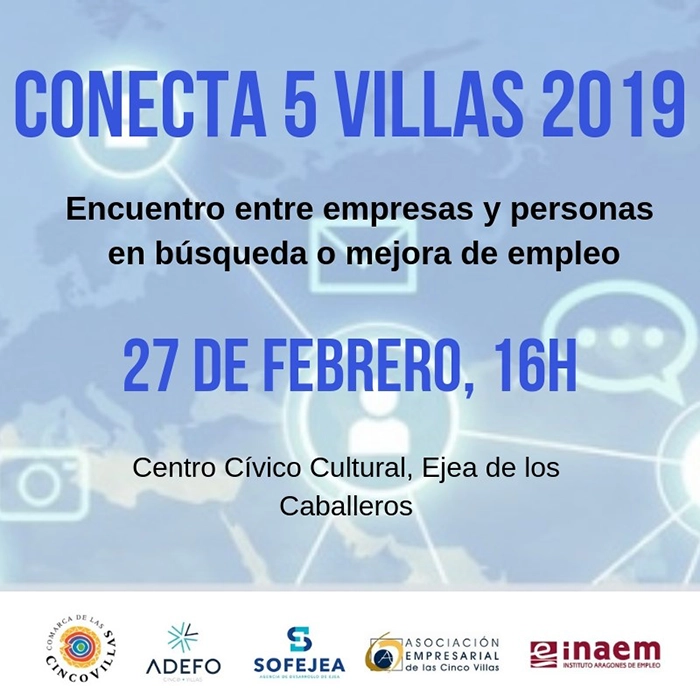 El próximo 27 de febrero en el Centro Cívico Cultural de Ejea de los Caballeros, a partir de las 16 h, tendrá lugar el encuentro Conecta 5 Villas 2019, promovido por el Instituto Aragonés de Empleo, Sofejea, Adefo Cinco Villas y Asociación Empresarial de las Cinco Villas, con el patrocinio de la Comarca de Cinco Villas.