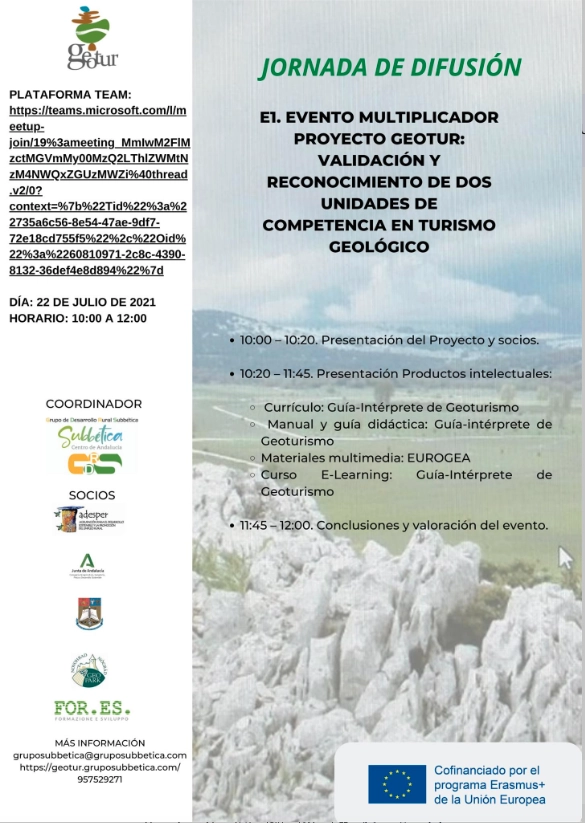 Por todo ello entendemos que los resultados del proyecto Geotur han alcanzado los objetivos inicialmente propuestos, o incluso los han mejorado, invitando a la ciudadanía a conocerlos en el evento multiplicador que vamos a desarrollar el próximo jueves, 22 de julio de 10 a 12 horas a través del canal TEAM. Para participar pueden inscribirse en el mismo a través del formulario Google drive desde la web del grupo de desarrollo (www.gruposubbetica.com), a través de nuestras Redes Sociales o llamando al 957529271.