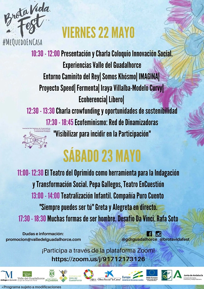 El festival, previsto para el pasado mes de marzo, tuvo que ser pospuesto debido a la crisis sanitaria por el Covid-19, por la que se aplicaron las recomendaciones de las autoridades sanitarias. Ante esta situación, y con toda la ciudadanía viviendo en confinamiento, desde GDR Valle del Guadalhorce se propone seguir adelante bajo una propuesta online a través de la plataforma Zoom. Todas las actividades son gratuitas y el programa pueden encontrarlo en la imagen adjunta.