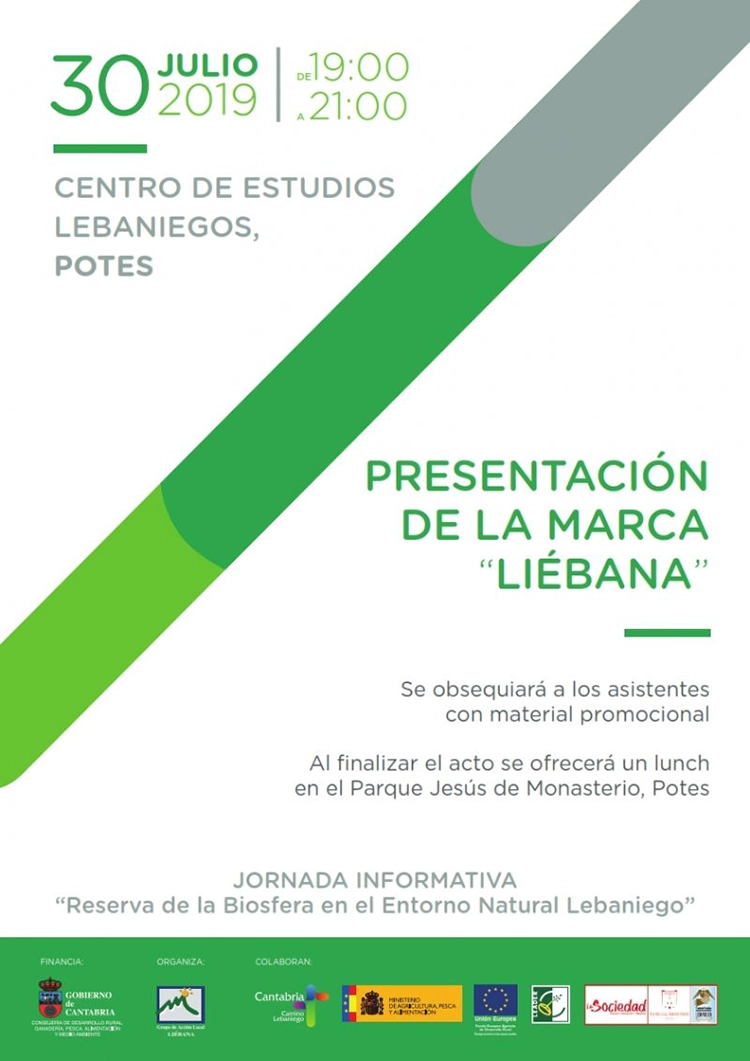El próximo 30 de Julio tendrá lugar, de 19:00 a 21:00 horas, en el Centro de Estudios Lebaniegos (Potes), la Presentación de la Marca Liébana. El evento está organizado por el Grupo de Acción Local Liébana y financiado con fondos FEADER de la Unión Europea, del Ministerio de Agricultura, Pesca y Alimentación, de la Consejería de Desarrollo Rural, Ganadería, Pesca, Alimentación y Medio Ambiente del Gobierno de Cantabria y de los Ayuntamientos de la Comarca de Liébana.