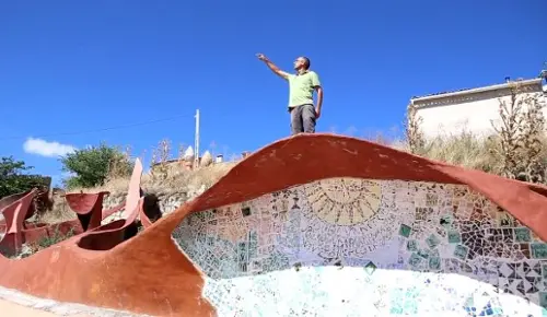 Gracias a las aportaciones de los fondos europeos de desarrollo rural, el visitante se encuentra con relojes de arena por doquier, maceteros, templetes, todos curvilíneos y de hechuras oníricas. Vicente García, de 50 años, es el autor de las esculturas. Con la cara curtida por el sol, llega sofocado, quizá porque no ha logrado superar la ITV. Se declara cansado. «¿Tendré la andropausia? ¡Qué va! -se dice- ¿Cómo no voy a estar cansado si he estado trabajando todo el verano?». Este prolífico artista ha hecho tantas esculturas para Olmeda que no sabe cuántas jalonan el paisaje. Su técnica se basa en el ferrocemento, que mezcla materiales humildes como mortero de cemento y malla de acero. «Es liviano pero a la vez muy resistente», ilustra mientras posa para la fotógrafa ante una de sus creaciones, una interpretación de la Dama de Elche. Si el curioso se asoma por detrás, podrá observar una extraña figura que evoca el casco del piloto de Mazinger Z, que marcó la infancia de García. «Soy artista, y a veces tengo el sentimiento de que lo que hago no aporta nada a la sociedad. Sin embargo, veo que mi trabajo contribuye a la supervivencia de Olmeda», apunta con satisfacción el escultor.