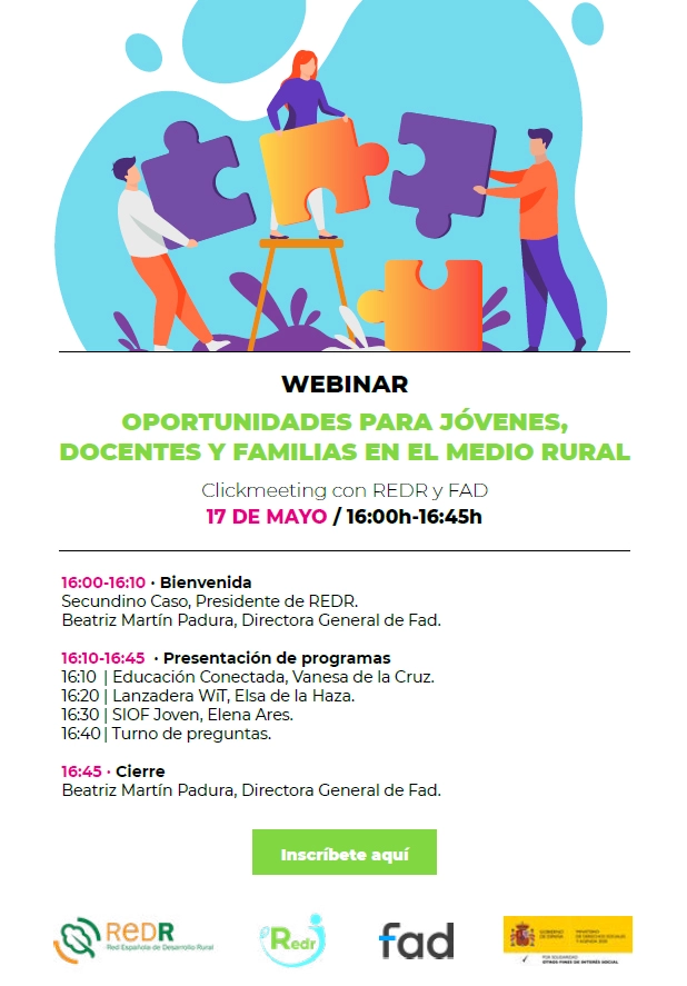 REDR organiza con Fad el webinar "Oportunidades para jóvenes, docentes y familias en el medio rural", que tendrá lugar el próximo lunes 17 de mayo a las 16:00h en la plataforma Clickmeeting. El objetivo de este encuentro será visibilizar varios de los proyectos e iniciativas que está llevando a cabo Fad y que pueden ser de especial interés para el medio rural.