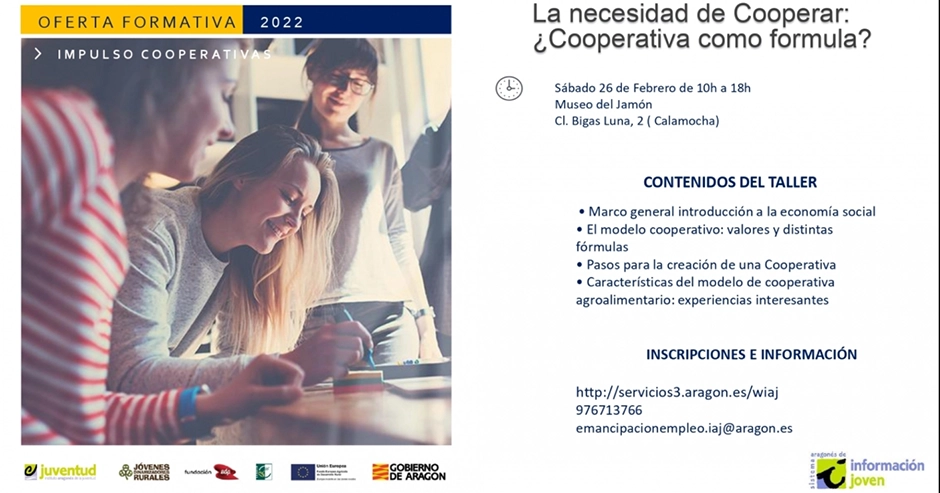 La necesidad de cooperar. ¿La cooperativa como fórmula? Con este lema, Jóvenes Dinamizadores Rurales organiza un taller con el Instituto Aragonés de la Juventud que tendrá lugar el próximo 26 de febrero de 10 a 18 horas en el Museo del Jamón de Calamocha.