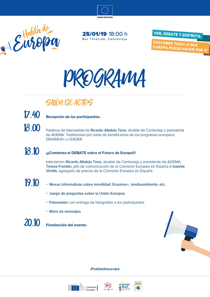 "Habla de Europa" es una campaña que la Representación de la Comisión Europea está llevando a cabo en localidades de menos de 10.000 habitantes. Antes de la celebración de las elecciones al Parlamento Europeo del 26 de mayo, la campaña llegará a localidades en Andalucía, Aragón, Asturias, Castilla y León y Extremadura. Aragón, concretamente Cantavieja, es el siguiente destino tras haber celebrar eventos similares en Tordesillas (Valladolid) y en Olivenza (Badajoz). Los ciudadanos están invitados a participar en estos debates abiertos y conocer de primera mano las líneas de trabajo de la Unión Europea y cómo éstas afectan a su vida diaria. Esta iniciativa se realiza en colaboración con los centros de información Europe Direct.