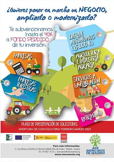 Estas ayudas con una cuantía total de 1.887.048 €, están destinadas a fomentar el Desarrollo Integral del territorio de la Sierra Oeste de Madrid a través de la diversificación de la economía local.
