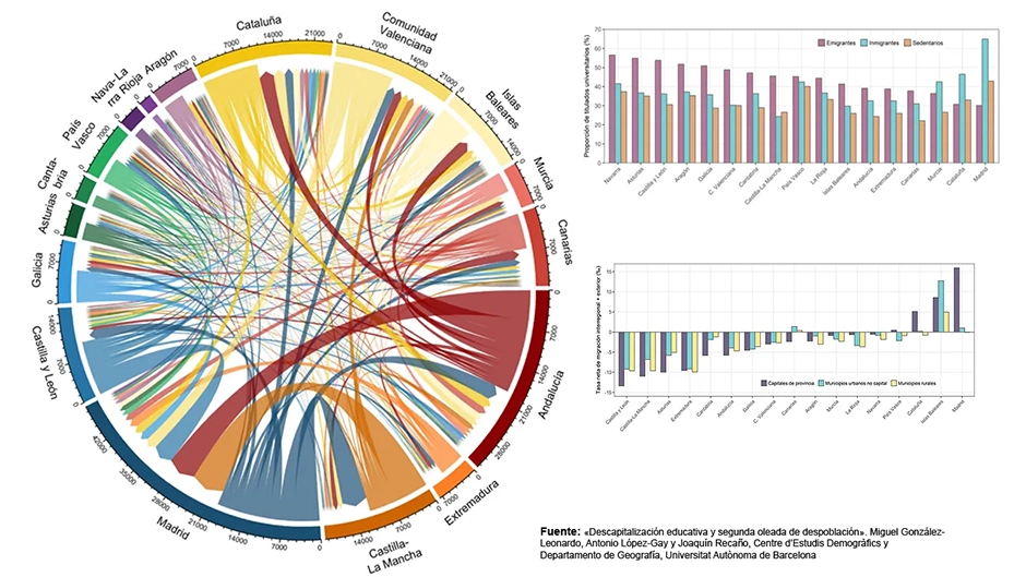 Entre el 45 y el 55 % de los jóvenes de 25 a 39 años nacidos en Castilla y León, Galicia, Asturias, Navarra, Castilla-La Mancha, Cantabria y Comunidad Valenciana que han emigrado hacia otras partes de España tienen estudios universitarios, frente al 30-35 % de los que permanecen en la región de nacimiento.