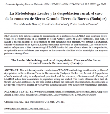 Se acaba de publicar en el último número de la revista ECONOMÍA AGRARIA Y RECURSOS NATURALES (EARN), editada por la ASOCIACIÓN ESPAÑOLA DE ECONOMÍA AGRARIA (AAEE), el artículo: "La Metodología Leader y la despoblación rural: el caso de la comarca de Sierra Grande-Tierra de Barros (Badajoz)".