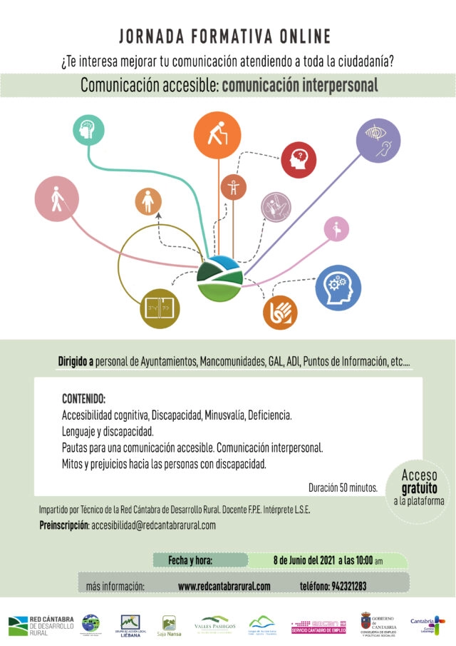 Esta jornada se enmarca dentro del proyecto "Asesoramiento inclusivo a entidades locales del medio rural cántabro" que desarrolla nuestra Asociación en las entidades locales localizadas dentro de los Grupos de Acción Local del medio rural cántabro y cuenta con el apoyo del Servicio Cántabro de Empleo del Gobierno de Cantabria. El taller será impartido por una técnica de la Red Cántabra de Desarrollo Rural - docente FPE - Intérprete LSE.