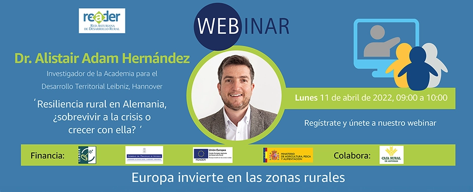 Los webinares organizados por la Red Asturiana de Desarrollo Rural (READER) para conocer un poco más sobre la gestión de las ayudas Leader en otros territorios vuelven el lunes 11 de abril. En esta ocasión viajaremos hasta Alemania de la mano del doctor Alistair Adam Hernández, investigador de la Academia para el Desarrollo Territorial Leibniz, Hannover (Alemania), que nos hablará sobre 'Resiliencia rural, ¿sobrevivir a la crisis o crecer con ella? Impulsando zonas y comunidades rurales más resilientes desde el Leader en la República Federal Alemana'.