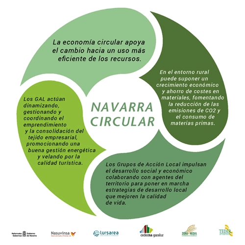 Los 4 Grupos de Acción Local de Navarra, Cederna Garalur, Teder, Consorcio Eder y Zona Media , han desarrollado en sus territorios el proyecto de cooperación Navarra Circular. El proyecto expone, presenta y difunde buenas prácticas entorno a la Economía Circular en el territorio rural navarra bajo el enfoque Leader. La economía circular en el entorno rural puede suponer un crecimiento económico y ahorro de costes en materiales, fomentando la reducción de las emisiones de CO2 y el consumo de materias primas.