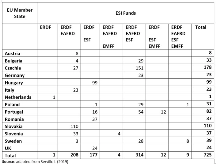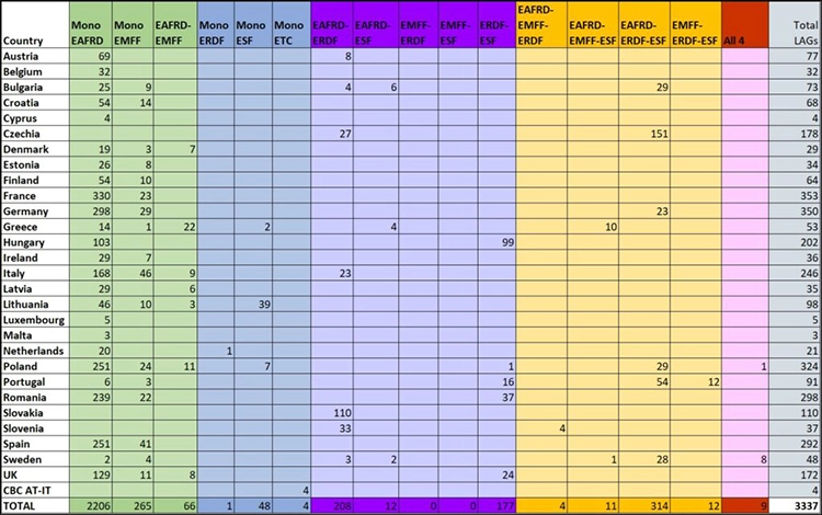Hay 3.337 grupos de acción local (GAL) en la UE (Tabla 1, actualizada en mayo de 2021 e incluye 3 GAL descontinuados: 2 en el Reino Unido y 1 en SK). En 15 Estados miembros hay 725 GAL que utilizan el CLLD como mecanismo de ejecución para parte de su asignación de financiación del FEDER. Sin embargo, en muchos de esos países, la mayoría de los GAL siguen siendo GAL del FEADER o del FEMP con monofondo tradicional.
