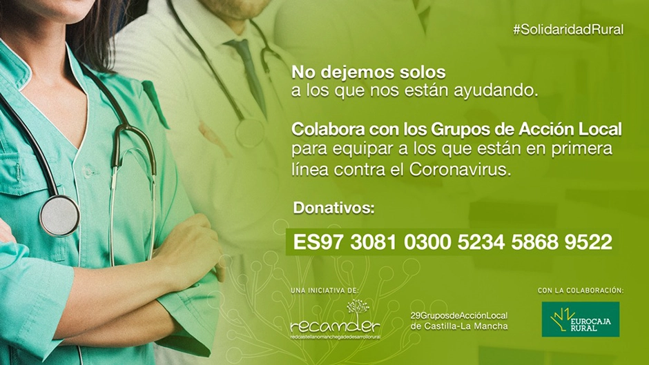 La Red Castellano Manchega de Desarrollo Rural (RECAMDER) y los 29 Grupos de Acción Local de Castilla-La Mancha han puesto en marcha una iniciativa solidaria con el fin de recaudar fondos para adquirir Equipos de Protección Individual (EPIs) para todos los profesionales que trabajan en primera línea contra el coronavirus o que cuidan de las personas mayores, que son el colectivo más vulnerable frente a esta epidemia.