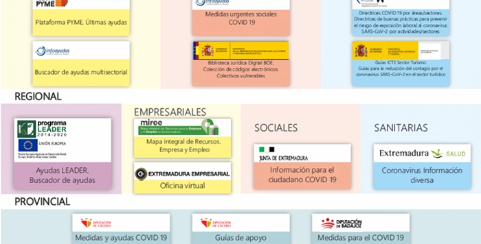 La primera sección "Ayudas", recoge la información más relevante (iniciativas, medidas, ayudas y subvenciones, protocolos de actuación, preguntas frecuentes, etc..) que proporcionan diversas fuentes clasificadas por escala europea, nacional, regional y local y por áreas empresarial, social, sanitaria.