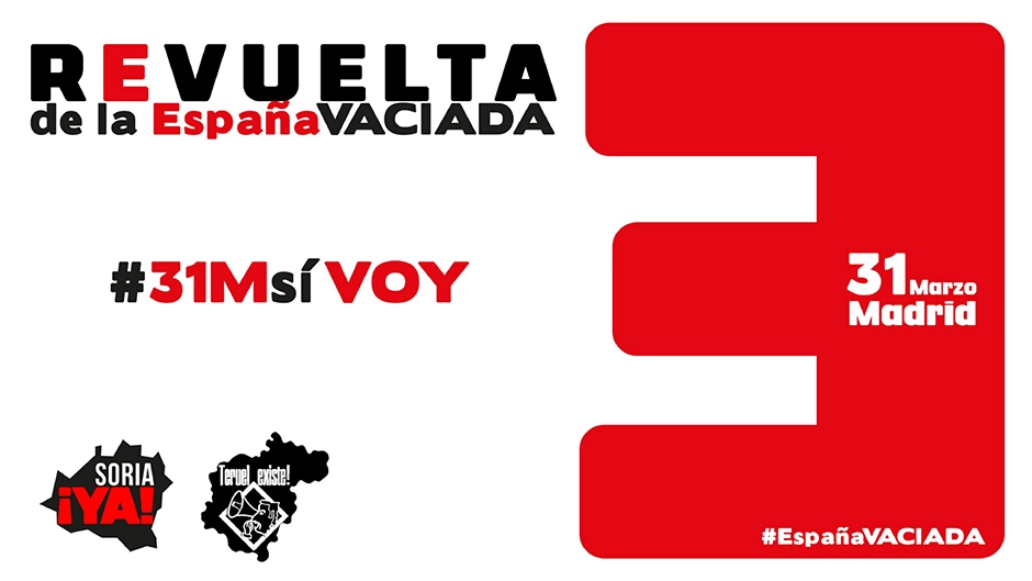 Las Plataformas ciudadanas Teruel Existe y Soria Ya, las dos provincias más despobladas del sur de Europa, impulsan y convocan la Revuelta de la España Vaciada que COMIENZA en una gran manifestación en Madrid el próximo 31 de marzo de 2019, para exigir medidas efectivas y urgentes contra la despoblación, y políticas que generen, de una vez, cohesión, equilibrio territorial y vertebración. A esta Revuelta se han sumado más de 71 plataformas del país (y siguen sumándose), muchas del medio rural despoblado, porque en el 70% de España vivimos solo 4 millones y medio de ciudadanos por la falta de igualdad y oportunidades, PORQUE SER POCOS NO RESTA DERECHOS.