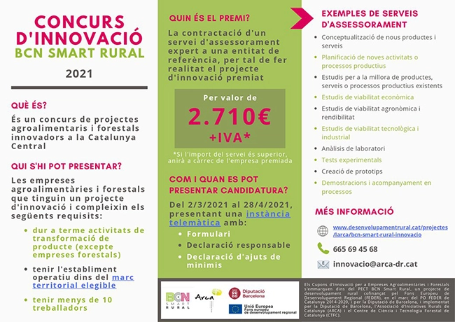 El Concurso de Innovación BCN Smart Rural es un concurso de proyectos agroalimentarios y forestales innovadores creado en el marco del proyecto BCN Smart Rural. El objetivo de la nueva iniciativa es promover la innovación en las microempresas del sector agroalimentario y forestal de los territorios rurales de la demarcación de Barcelona, tomando el relevo de las dos convocatorias de Cupones de Innovación realizadas durante las anualidades 2019 y 2020.