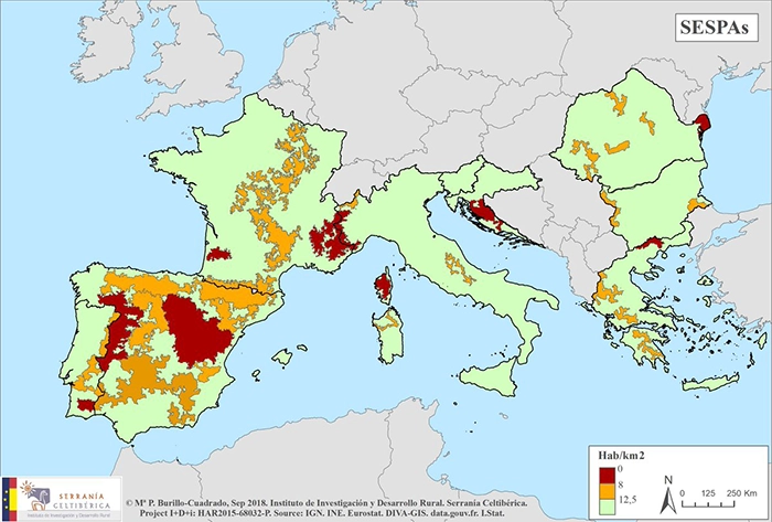 El resultado es el mapa de las "Áreas Escasamente Pobladas del Sur de Europa" o SESPAs, presentado al Vicepresidente del Parlamento Europeo Ramón Luis Valcárcel, donde se separa las "muy escasamente pobladas", con densidades por debajo de 8 hab/km2, de las que tienen densidades inferiores a 12,5 hab/km2 que dieron a conocer ayer. Este estudio ha permitido visibilizar que España es el país que, con creces, se encuentra más despoblado de todo el Sur de Europa, dado que en el 53% del territorio solo vive el 5% de la población; el siguiente país es Portugal con el 23%.