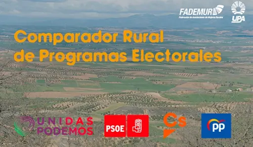La supuesta toma de conciencia de los partidos políticos sobre la importancia del medio rural no tiene un reflejo real en sus programas electorales. Los hombres y mujeres que acudan el próximo 28 de abril a depositar su voto en las elecciones generales seguirán ignorando, en gran parte, las propuestas de los candidatos en lo que afecta a los pueblos y sus habitantes. UPA y FADEMUR han analizado las 50 materias más importantes para los pueblos y las han plasmado en la segunda edición del Comparador Rural de Programas Electorales.